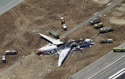 Photo of the wreckage of the Korean Asian Airlines crashed Boeing 777-200 at San Francisco International Airport on July 6, 2013