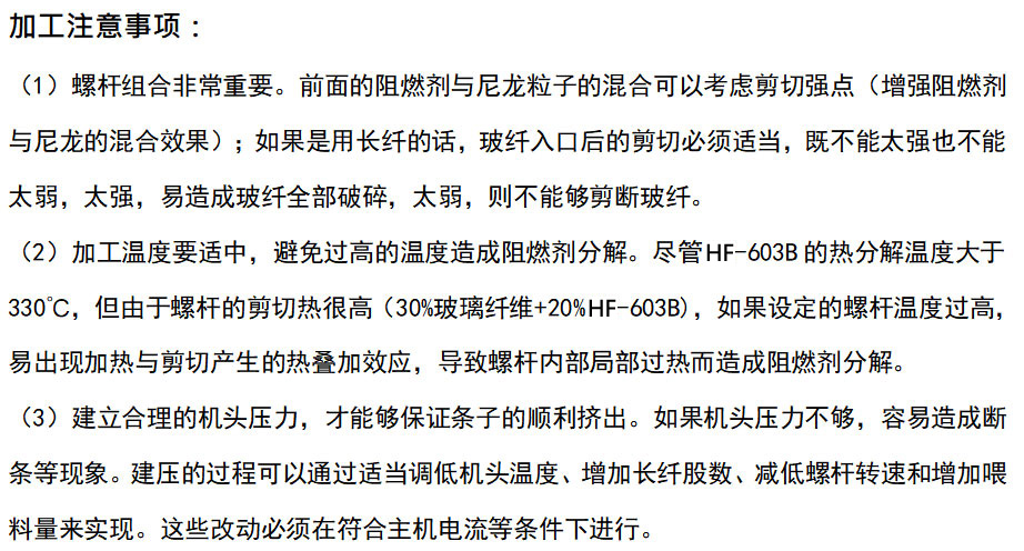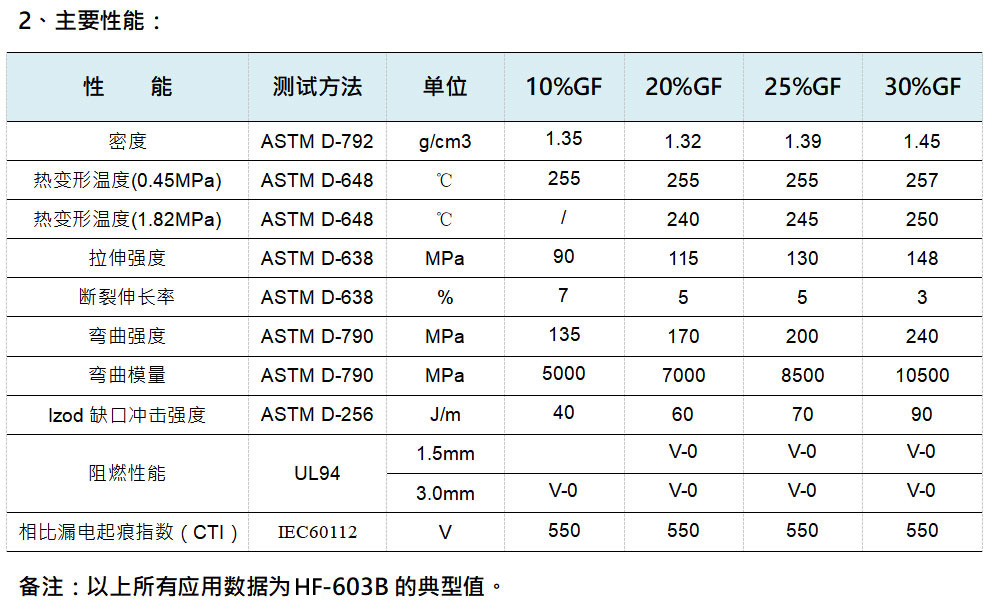 HF-603B玻纖增強(qiáng)PA6,66設(shè)計。以成炭、氣相阻燃機(jī)理起到阻燃作用。以HF-603B阻燃的玻纖增強(qiáng)PA6,66,阻燃達(dá)到UL94 V-0(1.5mm)并通過850℃灼熱絲測試。