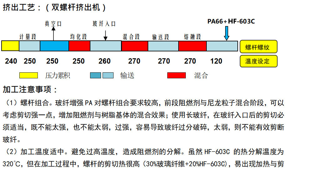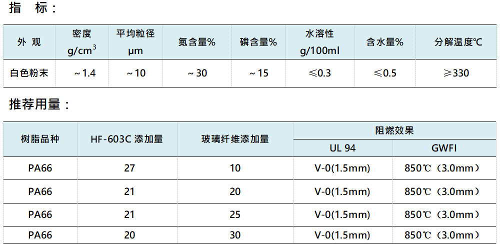 HF-603C專為玻纖增強(qiáng)PA6,66設(shè)計(jì),以成炭、氣相阻燃機(jī)理發(fā)揮阻燃效能。HF-603C制備的玻纖增強(qiáng)阻燃PA6,66,阻燃達(dá)到UL94 V-0(1.5mm);通過(guò)850℃灼熱絲測(cè)試;