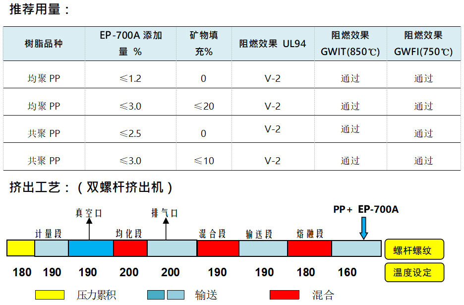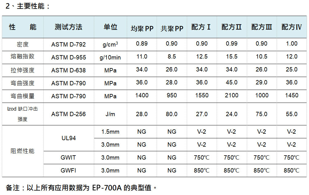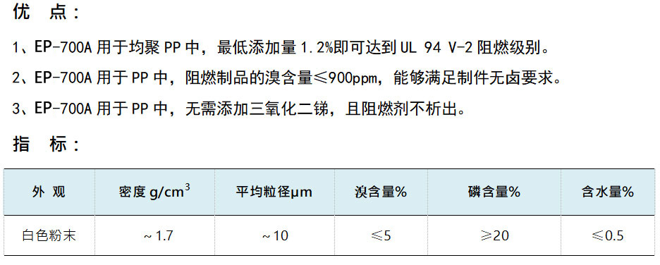EP-700A是一款新型氮、磷、溴協(xié)效的聚丙烯低鹵環(huán)保阻燃劑。與傳統(tǒng)溴系阻燃劑相比,EP-700A的添加量少,不需要添加Sb2O3,溴含量低,阻燃劑不析出,適合礦物填充體系及用于制造阻燃色母。EP-700A的阻燃制品可達到UL 94 V-2(1.5mm)級別,并通過IEC 60695灼熱絲測試GWIT 750℃和GWFI 850℃測試。阻燃制品可控制溴含量≤900ppm,并達到IEC 61249-2-21的無鹵要求。此外,阻燃制品還具有密度小、發(fā)煙量低、模具腐蝕性小等特點,主要用于制造電器插座、電器骨架、汽車接插件等產(chǎn)品。