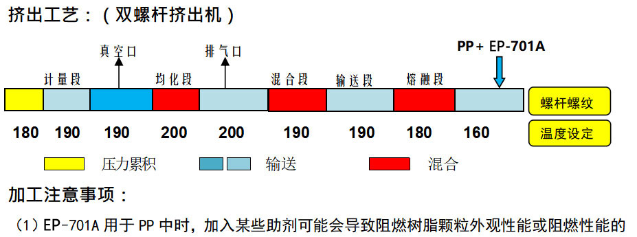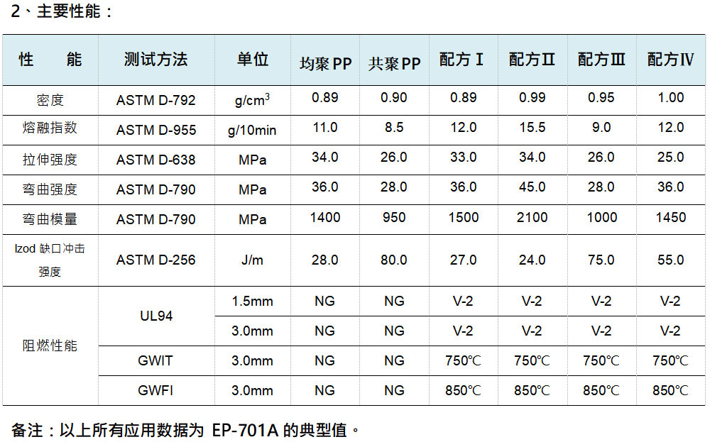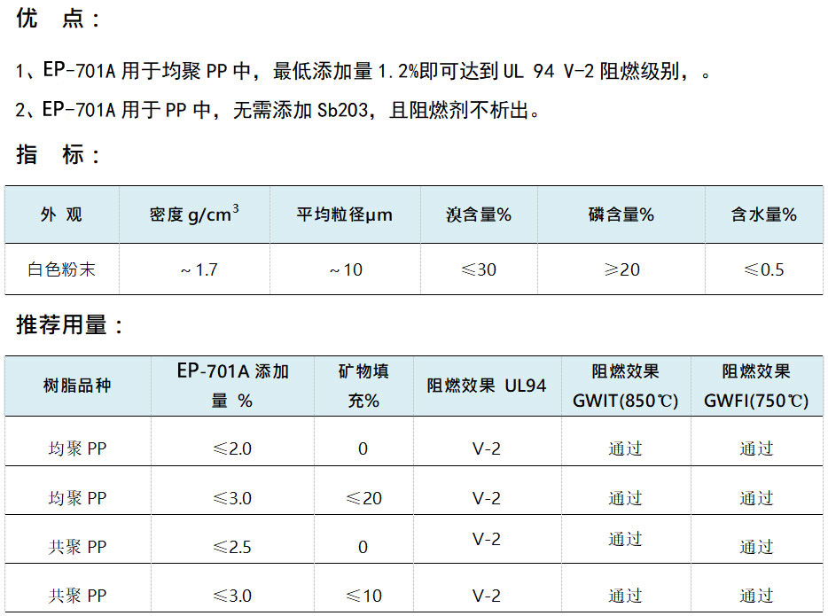 EP-701A是一款新型氮、磷、溴協(xié)效的聚丙烯低鹵環(huán)保阻燃劑。與傳統(tǒng)溴系阻燃劑相比,EP-701A的添加量少,不需要添加Sb2O3,溴含量低,阻燃劑不析出,可用于制造高濃度阻燃母粒。EP-701A的阻燃制品可達(dá)到UL 94 V-2(1.5mm)級(jí)別,并通過IEC 60695灼熱絲測(cè)試GWIT 750℃和GWFI 850℃測(cè)試。此外,阻燃制品還具有密度小、發(fā)煙量低、模具腐蝕性小等特點(diǎn),主要用于制造電器插座、電器骨架、汽車接插件等產(chǎn)品。