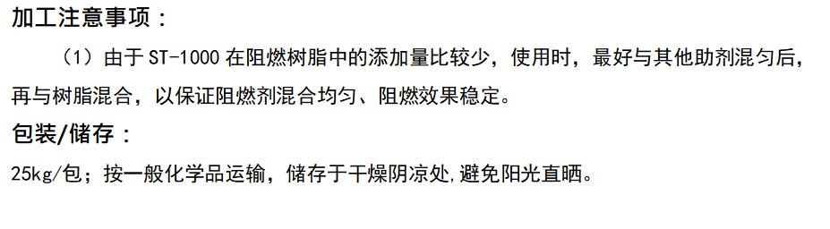 ST-1000是一款環(huán)保型磷系阻燃劑,對(duì)鹵系阻燃劑具有優(yōu)異的協(xié)效作用,并有一定的抑煙作用。完全符合歐盟的2002/95/EC號(hào)《關(guān)于在電氣電子設(shè)備中限制使用某些有害物質(zhì)指令》(即RoHS指令),及REACH法規(guī)等環(huán)保法規(guī)的要求。ST-1000主要用作三氧化二銻的替代物,用于PP、ABS、PBT、PVC等阻燃聚合物中時(shí),可以替代30~50%的三氧化二銻,能顯著降低阻燃聚合物的成本。ST-1000的PH值為中性,且具有極高的熱穩(wěn)定性、極低的水溶性和吸水性,在高溫加工中不變色不分解,不會(huì)水解析出,不會(huì)影響材料的電性能。